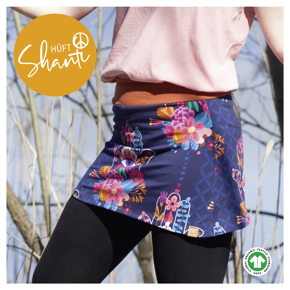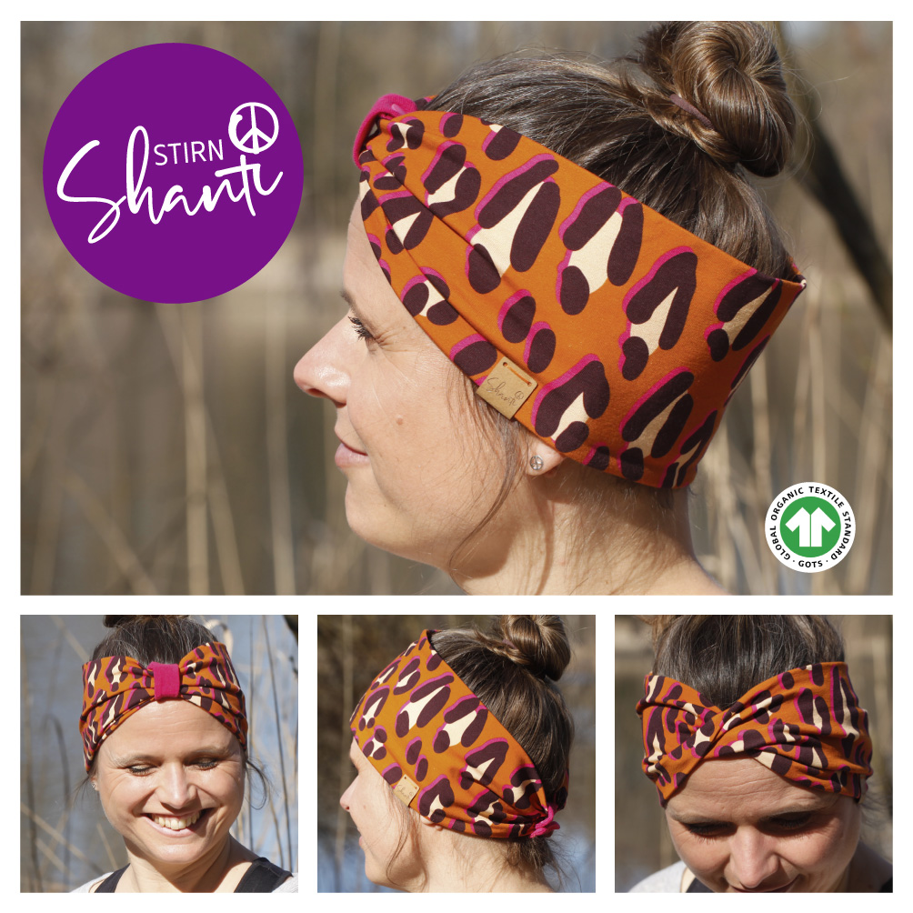 Wir verwenden ausschließlich Bio-Jerseystoffe der Firma Albstoffe, die allesamt GOTS zertifiziert sind. Die Firma Albstoffe färbt und verarbeitet seine Garne ausschließlich in Deutschland. Die Stoffe bestehen aus 95 % Baumwolle und 5 % Elasthan. Unsere Kleiderlabel bestehen aus veganem Leder und werden ebenfalls in Deutschland produziert.Da die Stirn- und Hüft-Shantis von uns selbst genäht werden, kann es zu einer Wartezeit von bis zu 14 Tagen kommen. Wir verwenden ausschließlich Stoffe aus der aktuellen Kollektion der Firma Albstoffe, weshalb du immer unterschiedliche Stoffmuster in unserem Sortiment finden wirst.